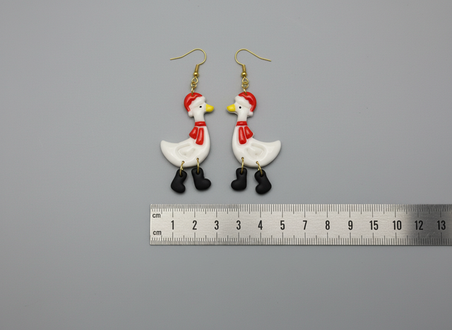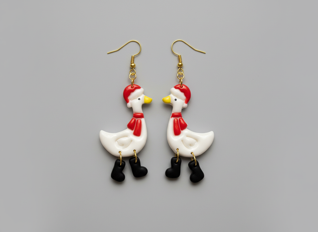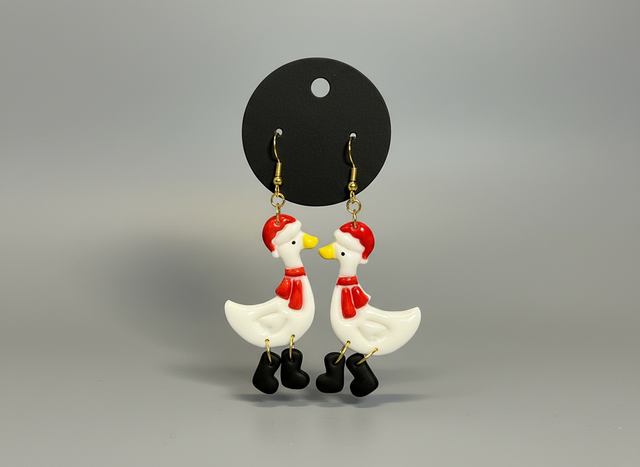 Ge din julstil ett lekfullt lyft med dessa unika, handgjorda örhängen föreställande söta julgäss i tomteluvor! Varje par är omsorgsfullt skulpterat i polymerlera och täckt med ett skyddande, glansigt lager resin som gör dem både hållbara och extra glänsande.